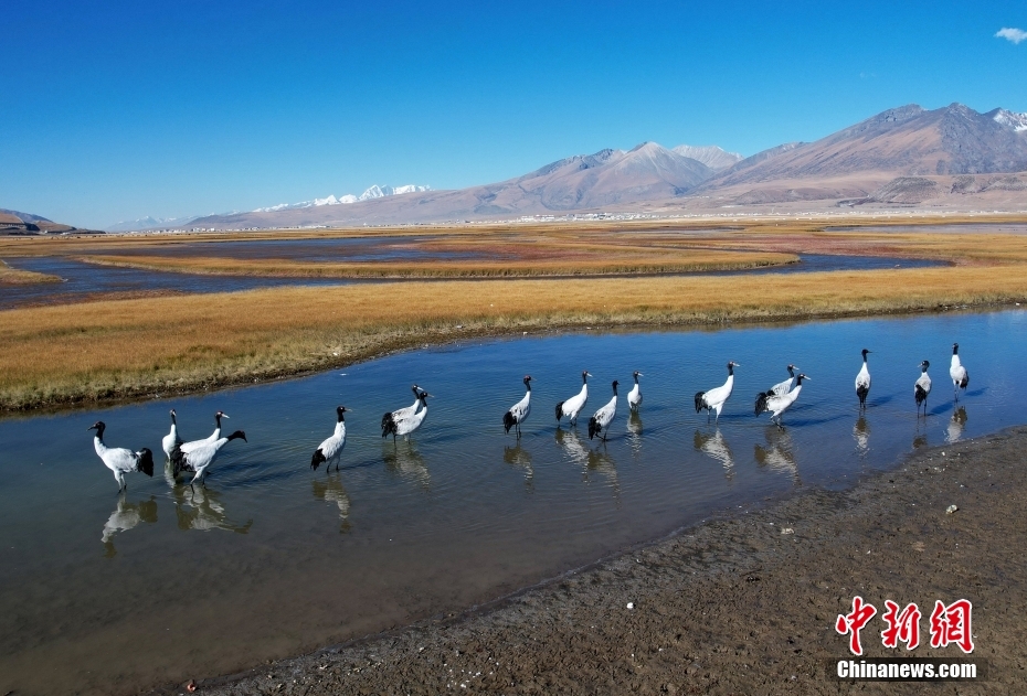 10月23日,成群的黑頸鶴在拉薩市當(dāng)雄縣阿熱濕地內(nèi)覓食。黑頸鶴是全球十五種鶴類中,唯一在高原地區(qū)繁殖和越冬的鶴類,屬中國國家一級保護(hù)野生動(dòng)物。
