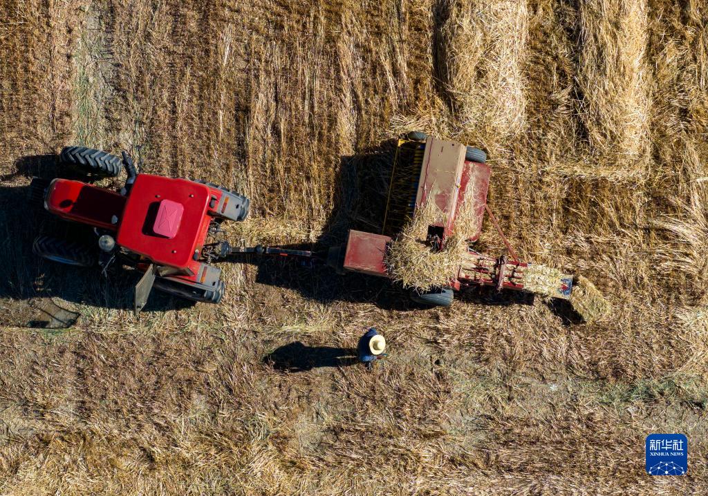 10月24日,村民駕駛農(nóng)機(jī)在拉薩市林周縣強(qiáng)嘎鄉(xiāng)曲嘎強(qiáng)村將收割過的牧草打包(無人機(jī)照片)。新華社記者 姜帆 攝