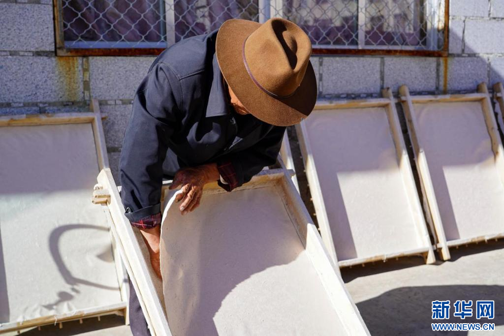 圖為次仁多杰進(jìn)行澆造、抄紙工藝步驟(10月20日攝)。新華網(wǎng)發(fā) 司秦菱 攝