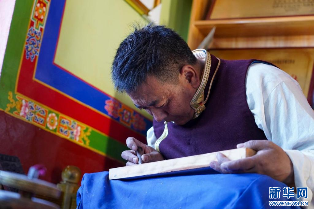 嘎瑪曲扎出生于普松鄉(xiāng)的雕刻世家,在爺爺?shù)挠绊懴?,他從小就對普松雕刻產(chǎn)生了濃厚的興趣。經(jīng)過長期的學(xué)習(xí)與磨練,嘎瑪曲扎的藏文書法雕刻手藝越來越好,并于2014年成為市級非物質(zhì)文化遺產(chǎn)代表性傳承人?!拔蚁氤蔀橄駹敔斈菢拥赂咄氐慕硯?,培養(yǎng)出一批新時代的雕刻書法藝術(shù)人才?!彼f。