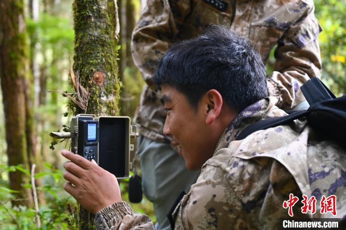 圖為索朗羅珠查看紅外相機。趙朗 攝