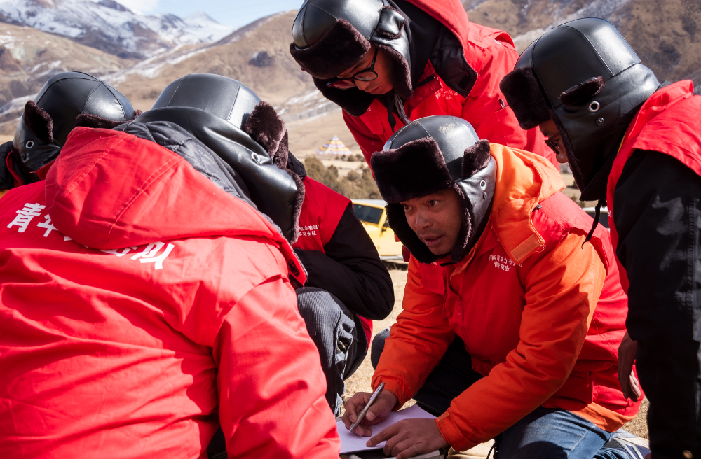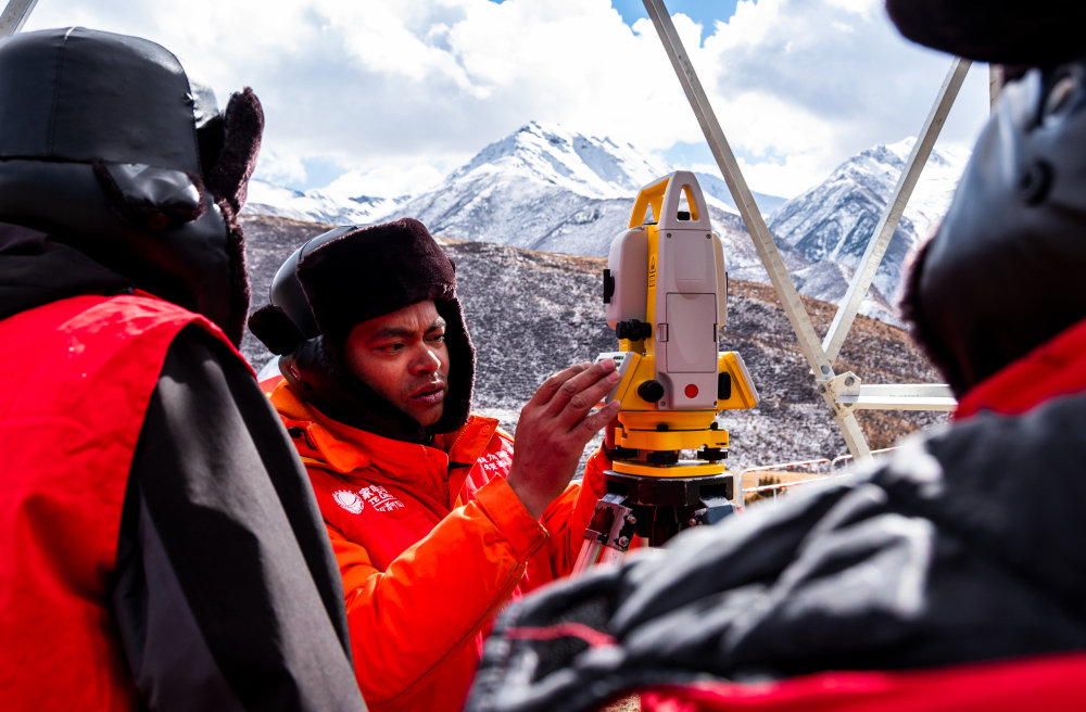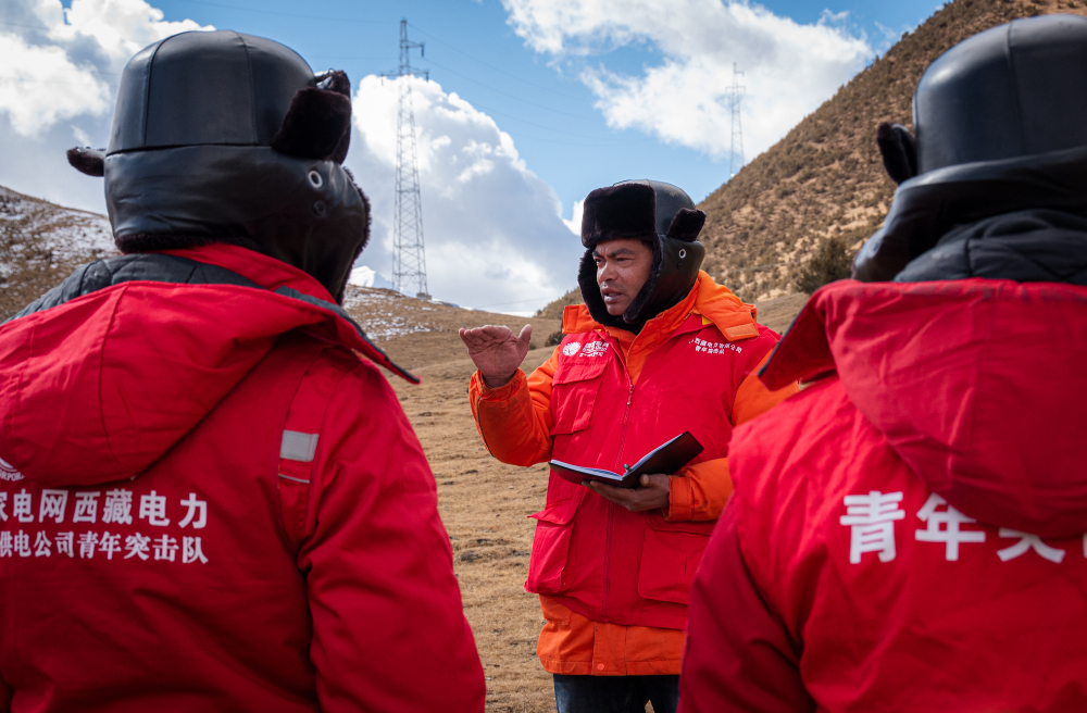 索縣榮布至丁青縣巴達(dá)35千伏線路工程負(fù)責(zé)人黃小洪在現(xiàn)場(chǎng)開(kāi)展線路弧測(cè)量教學(xué)。(趙清鵬 攝)