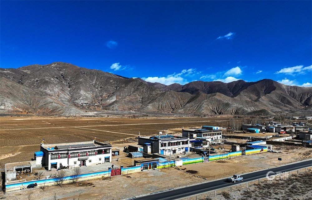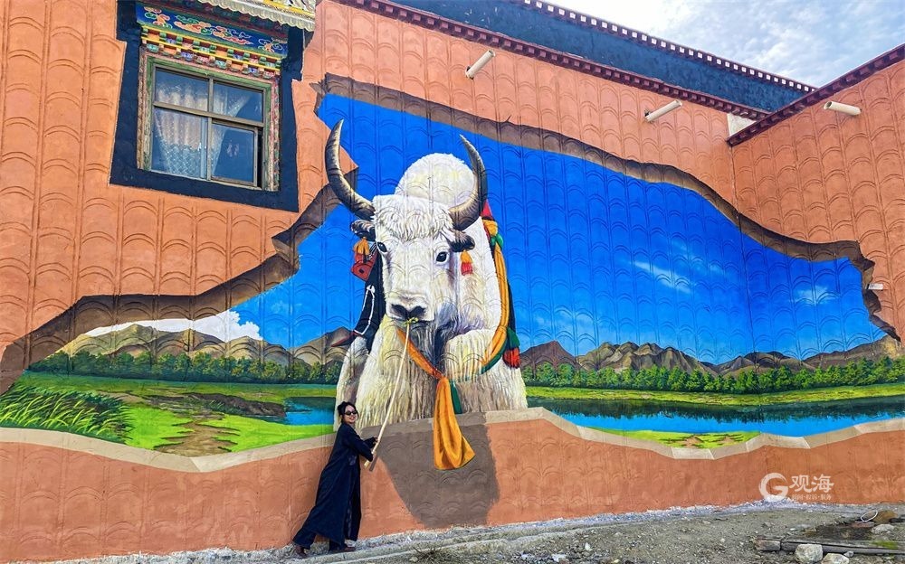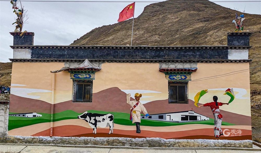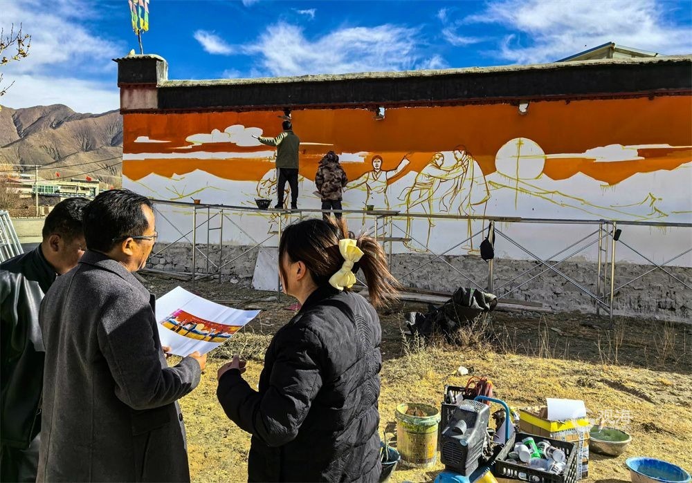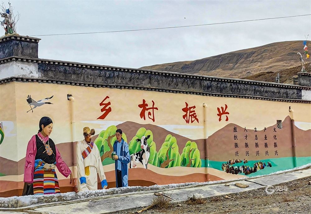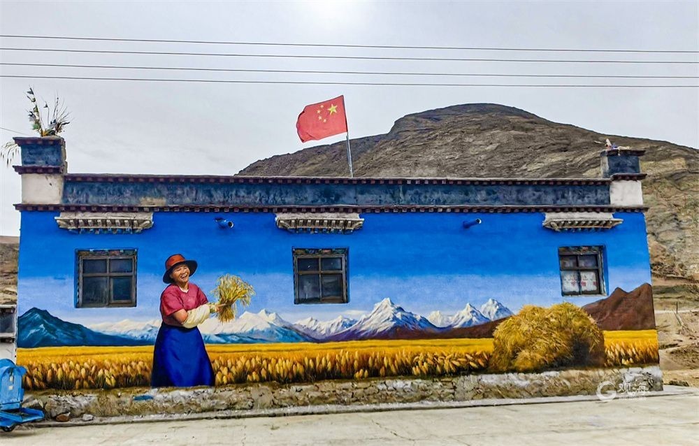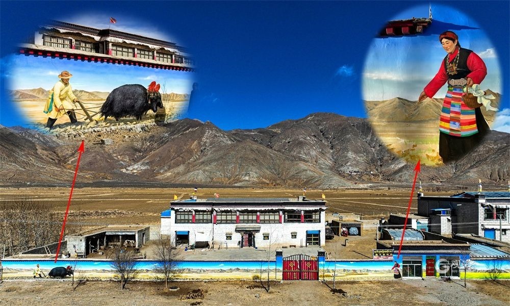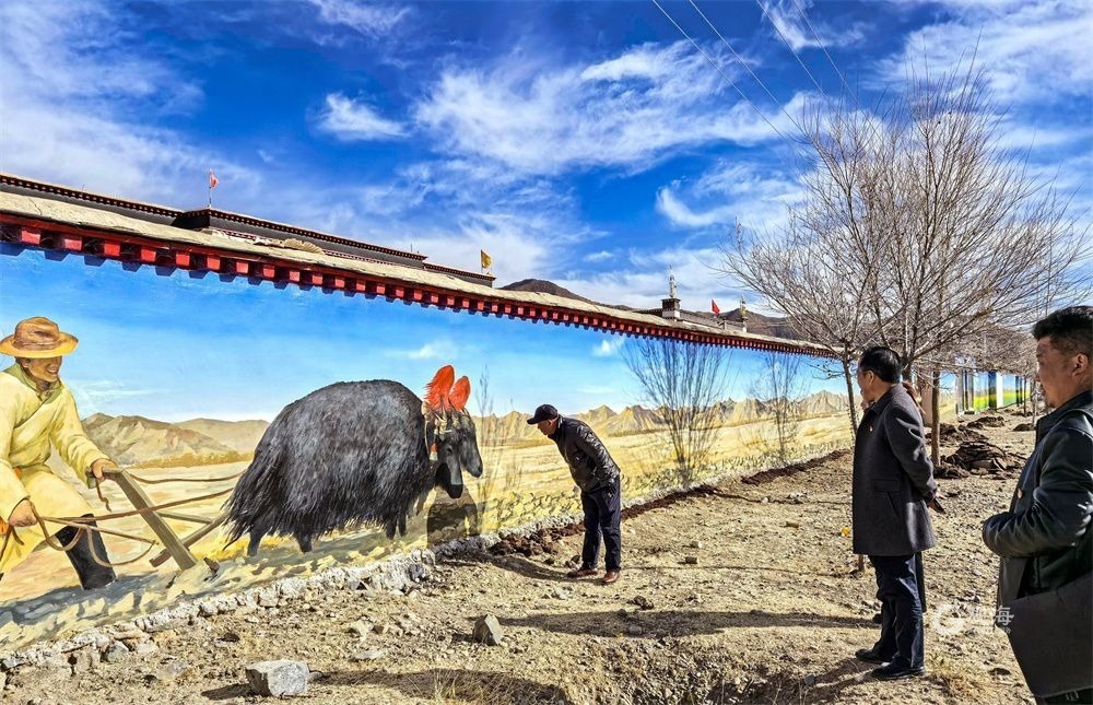 廣袤的高原上,在連綿起伏的山巒之下,是藏族農家趕著傳統(tǒng)的“二牛抬杠”耕耘的場景,旁邊的“阿佳”則撒下希望的青稞種子……這樣的場景當然不會出現(xiàn)在現(xiàn)在這個滴水成冰的季節(jié),而是躍然于藏家傳統(tǒng)村居的院墻之上?!拔壹疫@面墻原來就是貼滿了牛糞,現(xiàn)在畫上了我們平時勞動的景象,感覺比之前更好看了?!鄙V樽螀^(qū)東嘎鄉(xiāng)色定村的村民旦瓊說,此前的一年又一年,他都是把牛糞貼在墻上,固然有傳統(tǒng)的高原美感,但是與現(xiàn)在院墻上畫的鄉(xiāng)村振興的場景相比,還是現(xiàn)在的感覺更不錯。