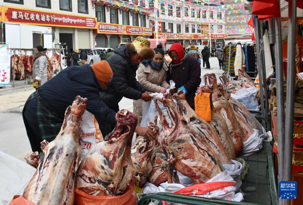 12月13日,在西藏日喀則市康馬縣冬季物資文化交流會上,當(dāng)?shù)厝罕娫谫徺I羊肉。新華社記者格桑朗杰 攝