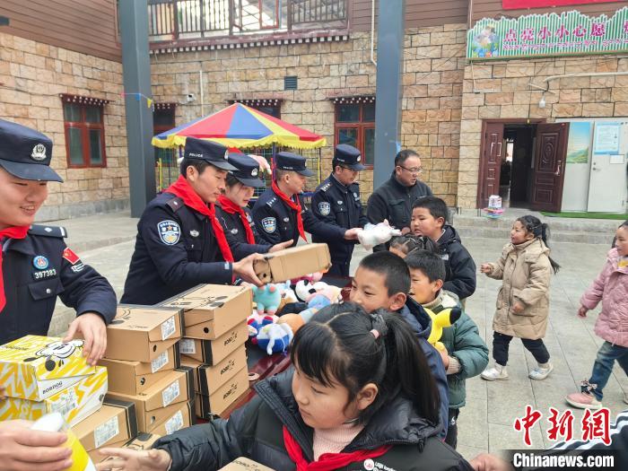 圖為玉麥邊境派出所民警為小朋友們發(fā)放“愛(ài)心禮包”。扎西根培 攝