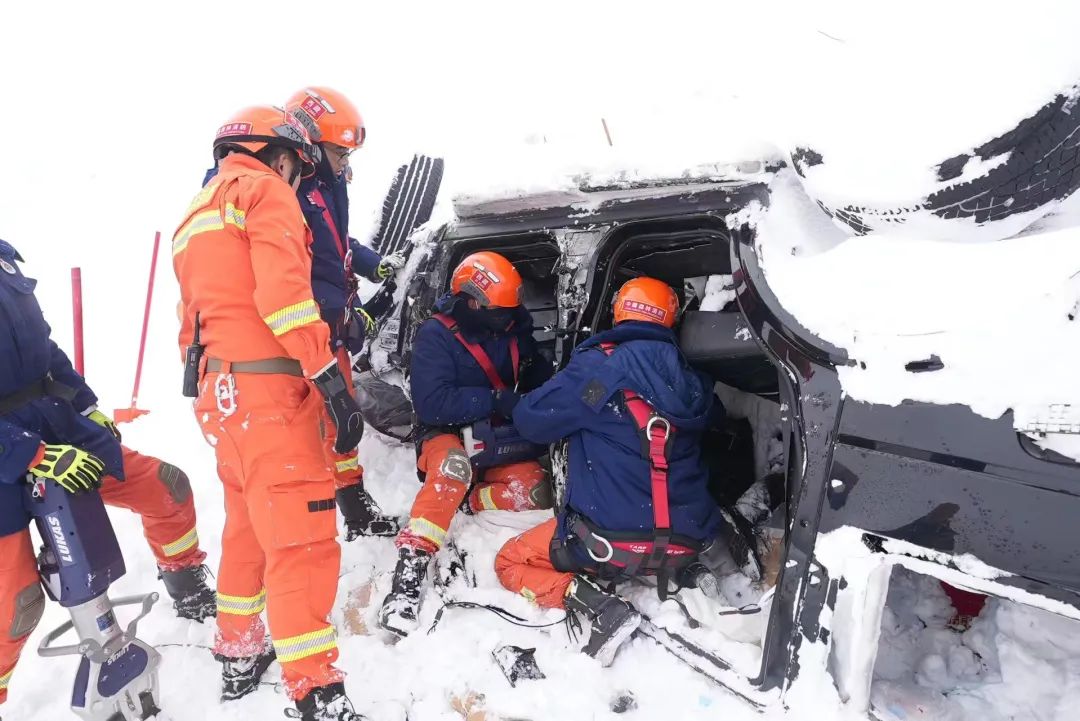 65名隊員到達現(xiàn)場時,天已經(jīng)黑透,周圍大風(fēng)呼嘯,數(shù)輛受災(zāi)車輛被直接埋壓在雪下,救援難度很大,很多隊員都心里直打顫。