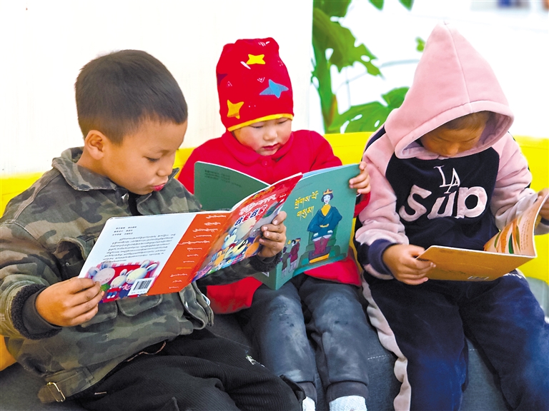 扎拉村的孩子在新時代文明實踐志愿服務隊成員的輔導下閱讀藏文繪本。謝筱純 王珊 攝