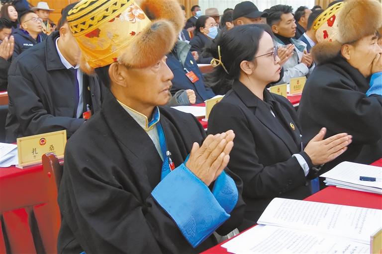 圖為基層委員認真聆聽政協(xié)拉薩市委員會工作報告。