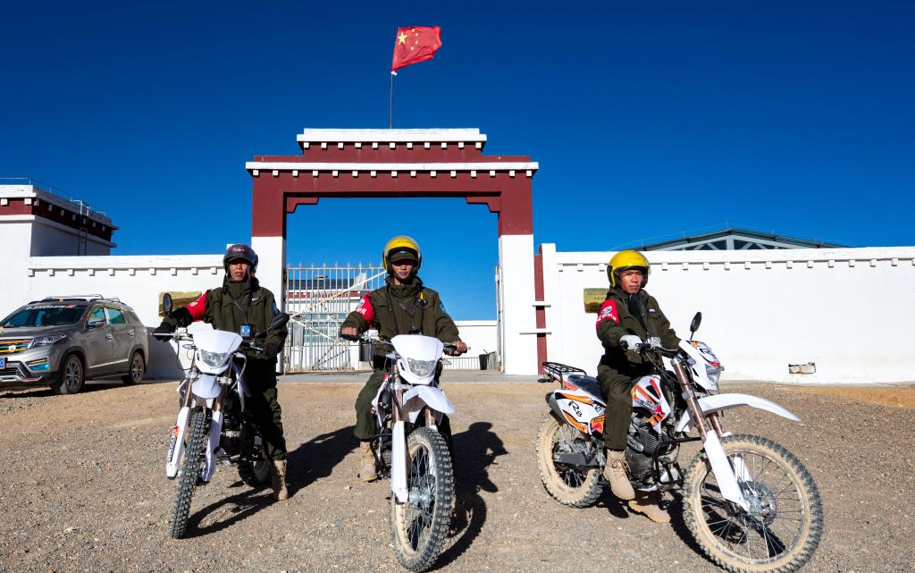 巡護(hù)隊員們騎上山地摩托車,準(zhǔn)備出發(fā)巡護(hù)(2023年12月17日攝)。新華社記者 姜帆 攝