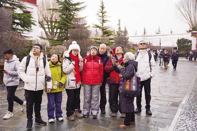 1月16日一大早,拉薩下起了2024年的第一場雪,雪中的布達拉宮有著別樣的美麗。王碧秀帶著幾位從上海來的游客參觀了這座擁有千年歷史的宮殿,細致的講解隨著雪花一起,將雪域高原厚重的歷史文化送進了游客的心里,撒下了希望的種子??傆幸惶欤@些種子會生根發(fā)芽,帶著王碧秀和無數(shù)導游們的期冀,開出絢麗的花朵,吸引更多人來到西藏、愛上西藏。