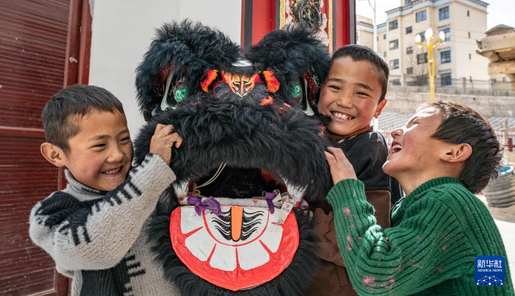 1月19日,在西藏昌都市洛隆縣碩督鎮(zhèn)碩督村,孩子們手捧獅子舞道具玩耍。新華社記者 丁增尼達(dá) 攝