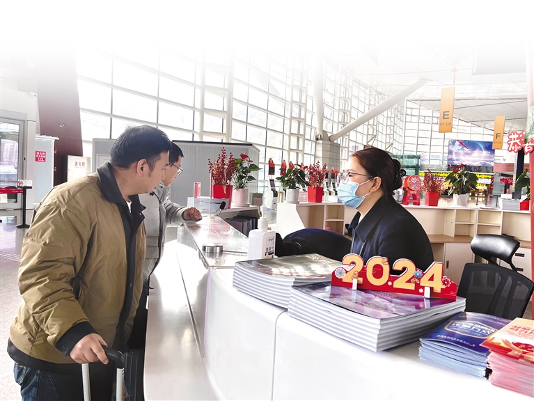 旅客正在拉薩貢嘎機場咨詢臺咨詢航班信息。記者 旦增蘭澤 攝