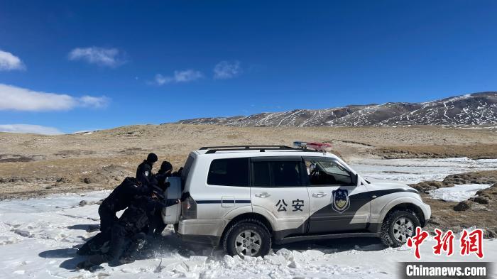 又經(jīng)歷一次陷車后,車輛實(shí)在無法前行。簡單吃過自熱午餐后,民警一行帶好裝備開始“步巡”,凜冽的寒風(fēng)似是帶著刀子般往骨頭里鉆,雪地反射的光讓人睜不開眼,此時海拔已將近5000米,氣溫零下23攝氏度。