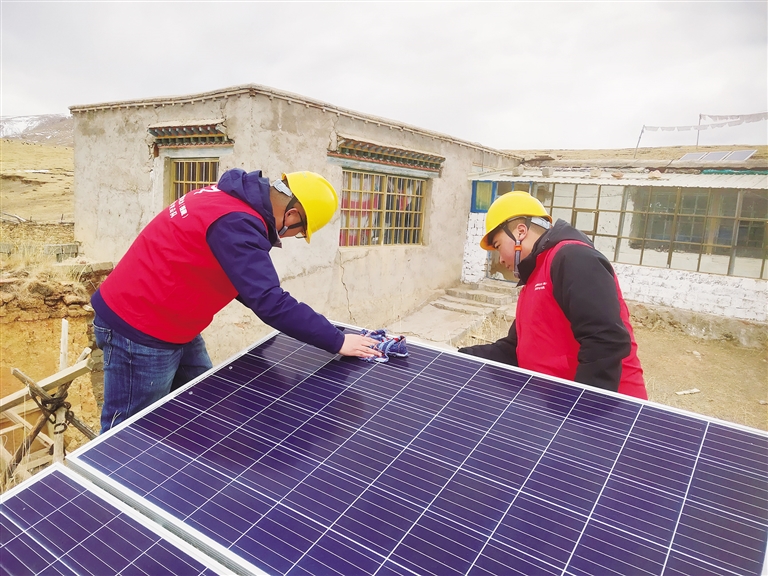 “次桑在家嗎?我們過來看一下你們新年準(zhǔn)備得怎么樣了?”聽到劉光輝的呼喚,孩子們都跑出來迎接這位“小黃帽”叔叔。劉光輝和羅桑歐珠進(jìn)屋放下年貨,顧不上休息,立馬搭梯子爬上次桑家的房頂,用抹布拂去光伏電板上的塵土,拿出工具仔細(xì)檢查電源和光伏設(shè)備是否有損壞?!按紊<矣玫氖俏覀兊牡谝淮柲芄夥姲?,這個(gè)電板要經(jīng)常擦拭,保持表面干凈,發(fā)電效率會(huì)更好?!眲⒐廨x說。檢修完光伏電板后,劉光輝和羅桑歐珠又回到屋內(nèi)檢查次桑家的電路線路,對(duì)插排插座等可能存在安全隱患的地方進(jìn)行認(rèn)真排查。確保沒有問題后,兩人將之前昏暗的燈泡全部換成了最新的節(jié)能燈泡,整個(gè)屋子一下亮堂了起來。