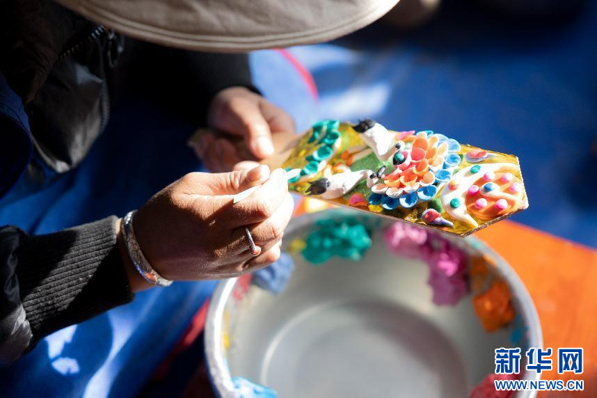 圖為西藏現(xiàn)代服務業(yè)技工學校的學員制作出的卡塞“德格”(1月29日攝)。新華網(wǎng)發(fā) 李騰 攝