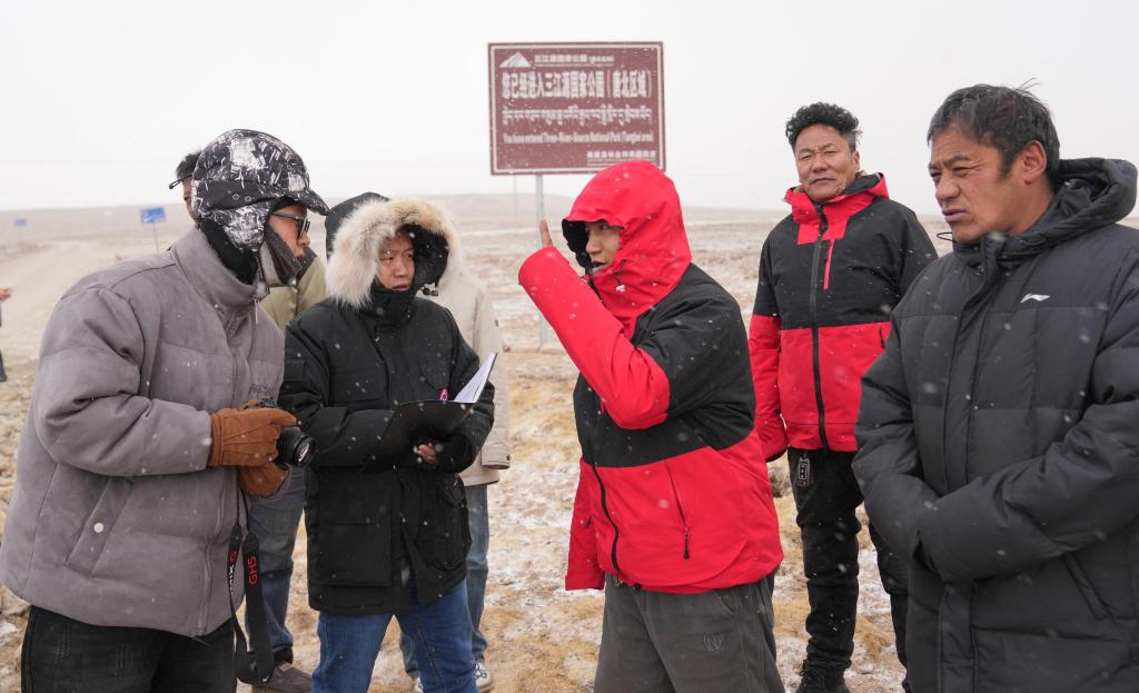 新華社記者(左二)在三江源國家公園(唐古拉山北部片區(qū))采訪。新華社記者 晉美多吉 攝
