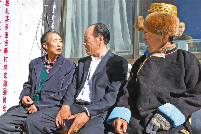 德吉新村村民丹增一身黑氆氌藏裝、頭戴“次仁金廓(金絲帽)”,操著一口地道的扎囊方言,要不是村里人的介紹,誰也看不出他其實并非“藏家大叔”。