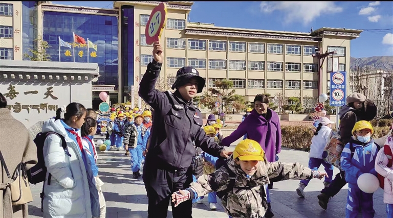 站在學校門口,等待孩子的家長央金感觸頗深,她告訴記者,每次開學前、開學時、開學后,都能看到民警們忙碌的身影。為學校家長提供幫助,為學生消除安全隱患,營造了安全、和諧、文明的校園環(huán)境,十分感謝他們?!敖裉靾蟮嚼?,我們看到警察叔叔和阿姨就覺得很安心、很開心?!睂嶒炐W3年級10班學生白瑪娜薩說。