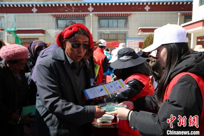 圖為瓊結縣志愿者為民眾發(fā)放宣傳禮品。倫珠澤仁攝