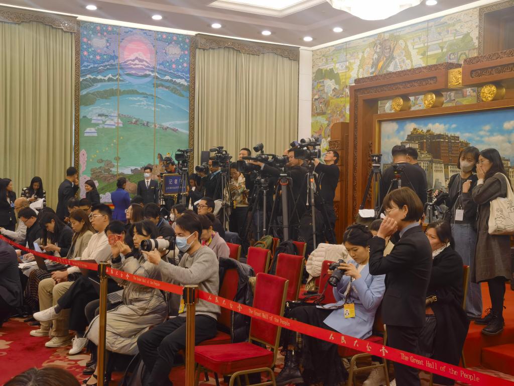 3月6日下午,中外記者在人民大會(huì)堂西藏廳參加十四屆全國人大二次會(huì)議西藏代表團(tuán)開放團(tuán)組活動(dòng)。(新華社記者韓潔 攝)
