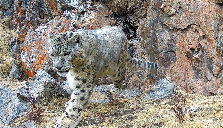 圖為漫步的雪豹。(祁連山國(guó)家公園青海省管理局供圖)