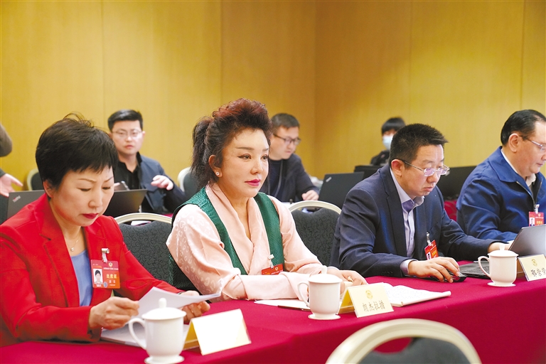 住藏全國(guó)政協(xié)委員朗杰拉措(中)在少數(shù)民族界討論時(shí)發(fā)言。