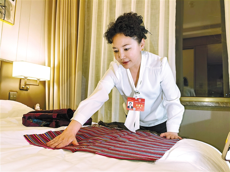 住藏全國(guó)政協(xié)委員卓嘎在駐地整理民族服裝。
