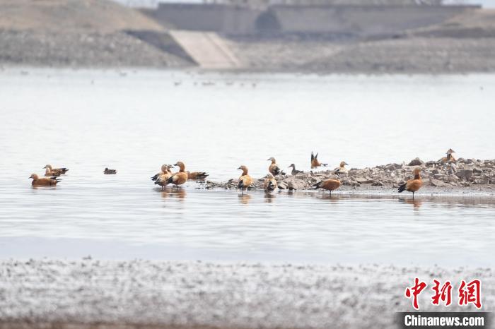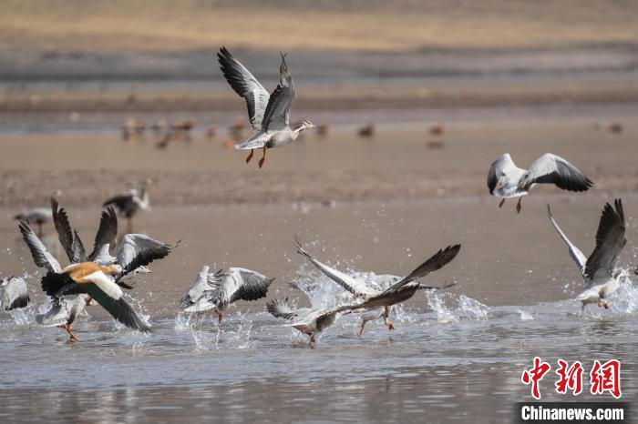 圖為斑頭雁、赤麻鴨在林周縣虎頭山水庫(kù)嬉戲。貢嘎來(lái)松 攝