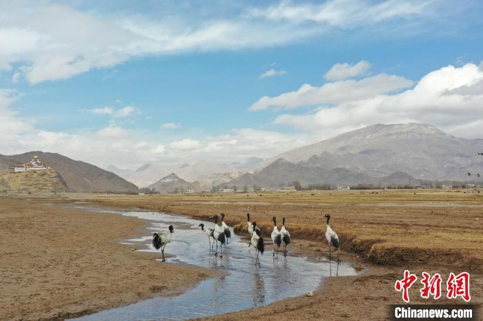 圖為黑頸鶴在林周縣境內(nèi)的農(nóng)田里覓食、嬉戲。貢嘎來(lái)松 攝