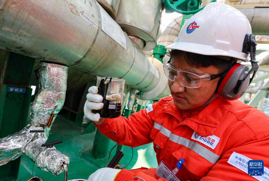 強巴在“渤海世紀號”(FPSO)上檢查原油油樣(3月7日攝)。 新華社記者 姜帆 攝