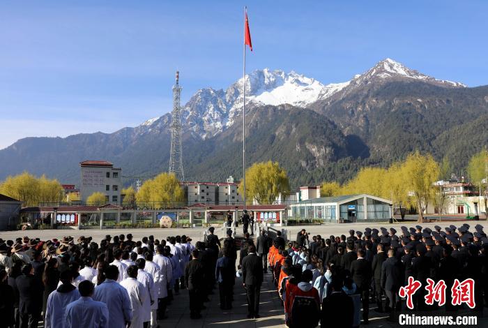 圖為吉隆出入境邊防檢查站移民管理警察將鮮艷的五星紅旗護(hù)送至升旗臺。肖富貴 攝