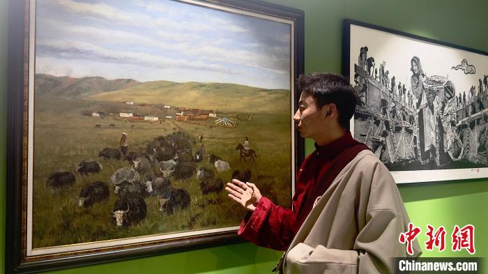 大賽美術(shù)組二等獎(jiǎng)獲得者、西藏大學(xué)藝術(shù)學(xué)院美術(shù)系研一學(xué)生郭扎正在向觀眾展示自己的美術(shù)作品。澤塔雍措 攝