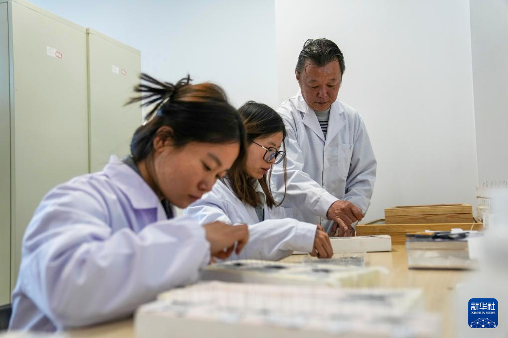 在位于拉薩的西藏自治區(qū)高原生物研究所,達娃(右)輔導(dǎo)學(xué)生制作標本(4月22日攝)。新華社記者 旦增尼瑪曲珠 攝