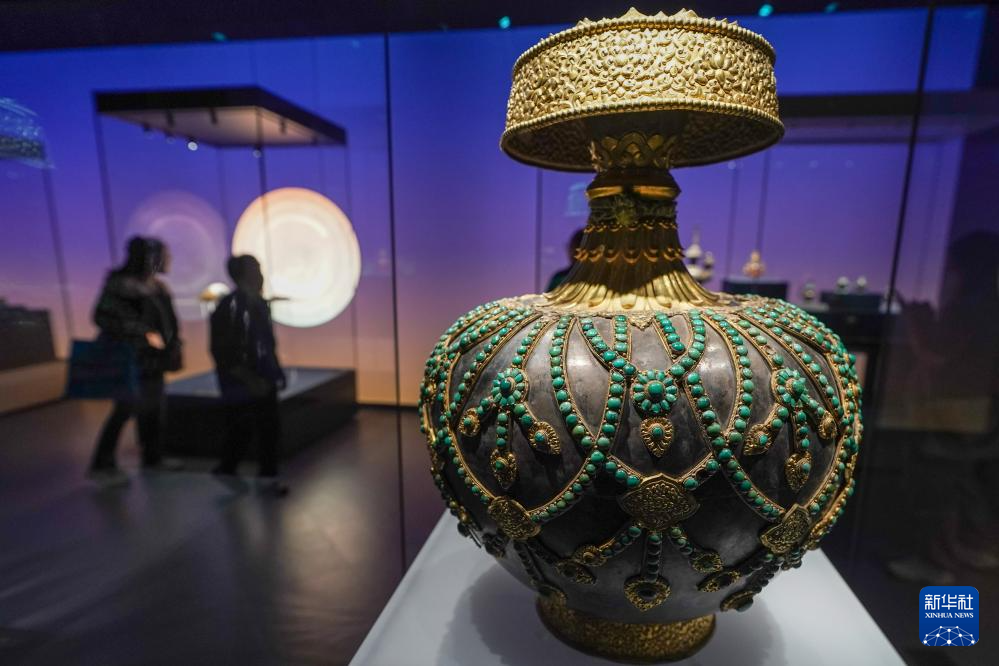 5月11日,“布達(dá)拉宮——來(lái)自雪域的世界文化遺產(chǎn)”展覽現(xiàn)場(chǎng)展出的“銀質(zhì)嵌松石瓔珞尊勝瓶”。新華社記者 李博 攝