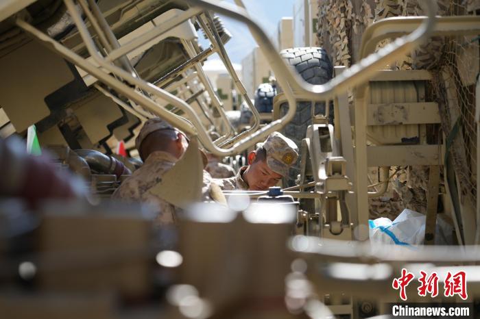 圖為某旅官兵正在對(duì)車(chē)輛傳動(dòng)軸進(jìn)行檢查維護(hù)。徐建欣 攝