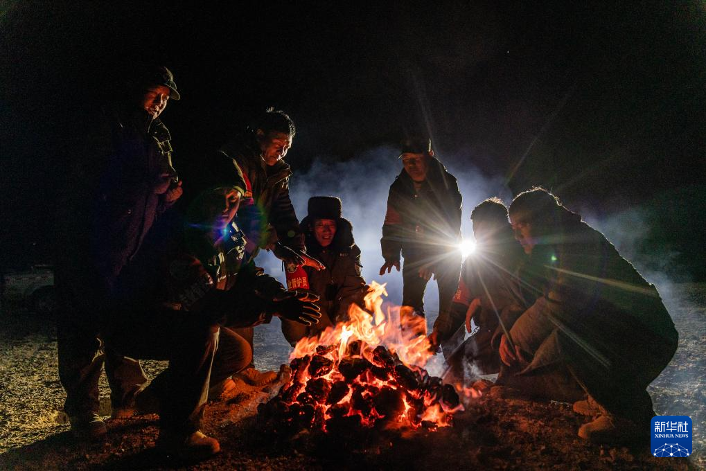 野生動(dòng)物專(zhuān)業(yè)管護(hù)隊(duì)員在宿營(yíng)地里烤火,燃料是野牦牛的糞便(5月10日攝)。新華社記者 丁增尼達(dá) 攝