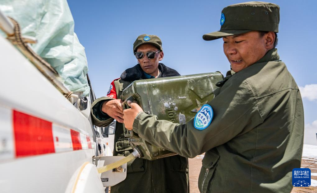 野生動(dòng)物專(zhuān)業(yè)管護(hù)隊(duì)員在巡護(hù)途中給車(chē)輛加油(5月9日攝)。新華社記者 丁增尼達(dá) 攝