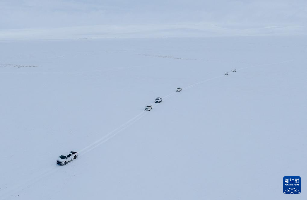 野生動(dòng)物專(zhuān)業(yè)管護(hù)隊(duì)員的車(chē)隊(duì)在大雪中巡護(hù)(無(wú)人機(jī)照片,5月8日攝)。新華社記者 丁增尼達(dá) 攝