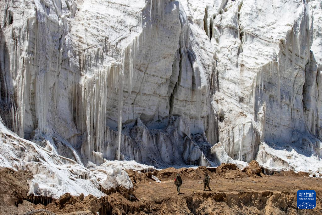野生動(dòng)物專(zhuān)業(yè)管護(hù)隊(duì)員在無(wú)人區(qū)深處的藏色崗日冰川巡查(5月11日攝)。新華社記者 姜帆 攝