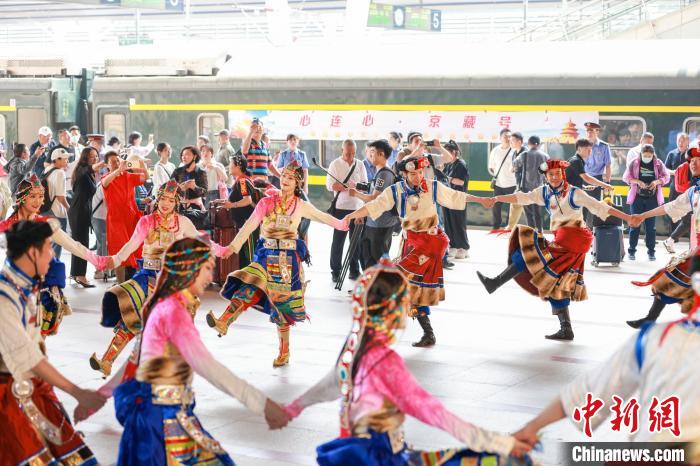 發(fā)車儀式上,大型藏族舞蹈表演歡迎游客乘車。記者 賈天勇 攝