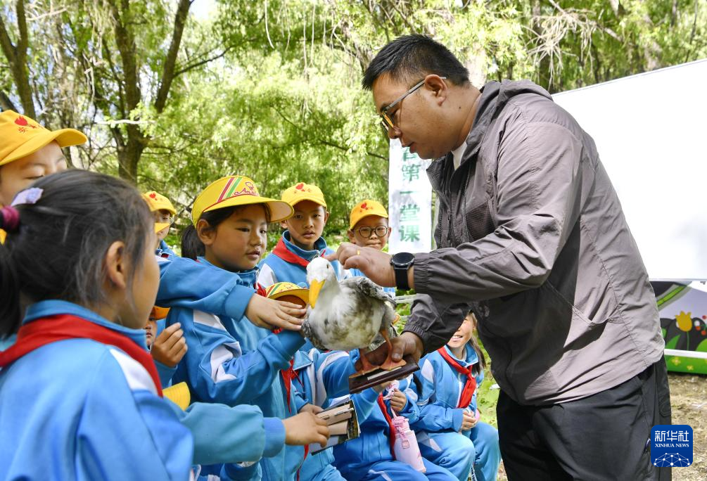 5月22日,拉魯濕地國家級(jí)自然保護(hù)區(qū)管理局局長拉姆次仁在活動(dòng)中邀請(qǐng)小學(xué)生做“小小宣講員”和“拉魯濕地小衛(wèi)士”。新華社記者 張汝鋒 攝