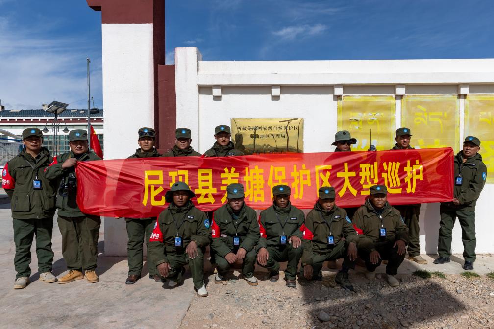 野生動物專業(yè)管護隊員出發(fā)巡護前在尼瑪縣縣城的羅布玉杰管護站合影(5月7日攝)。新華社記者 姜帆 攝