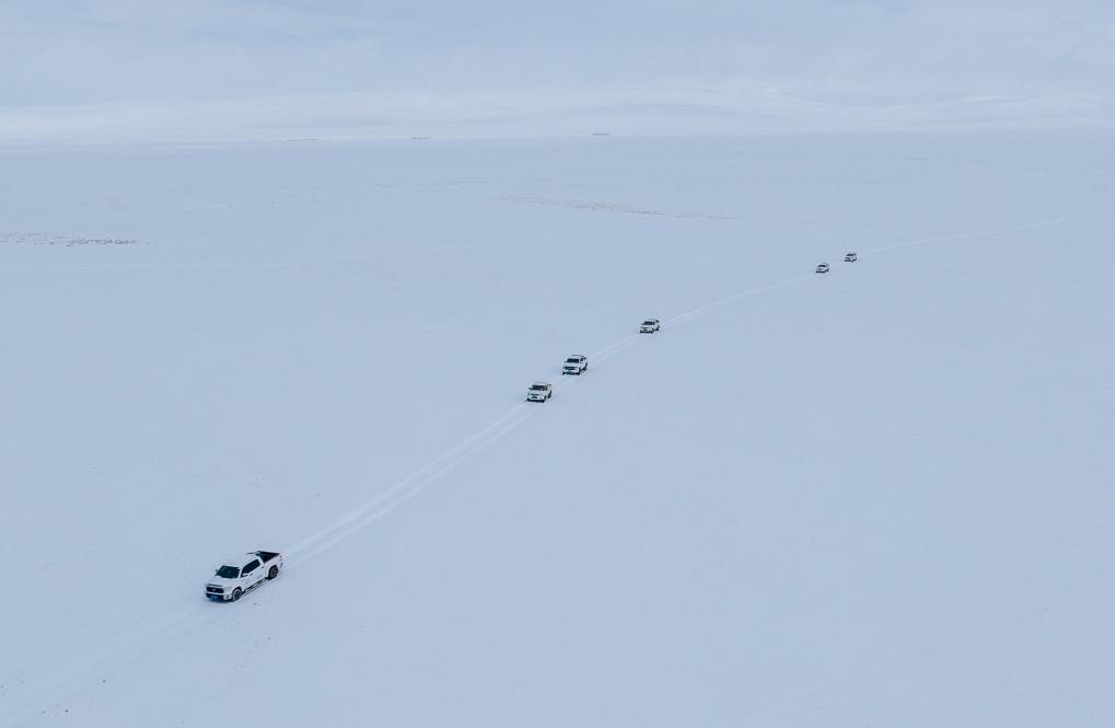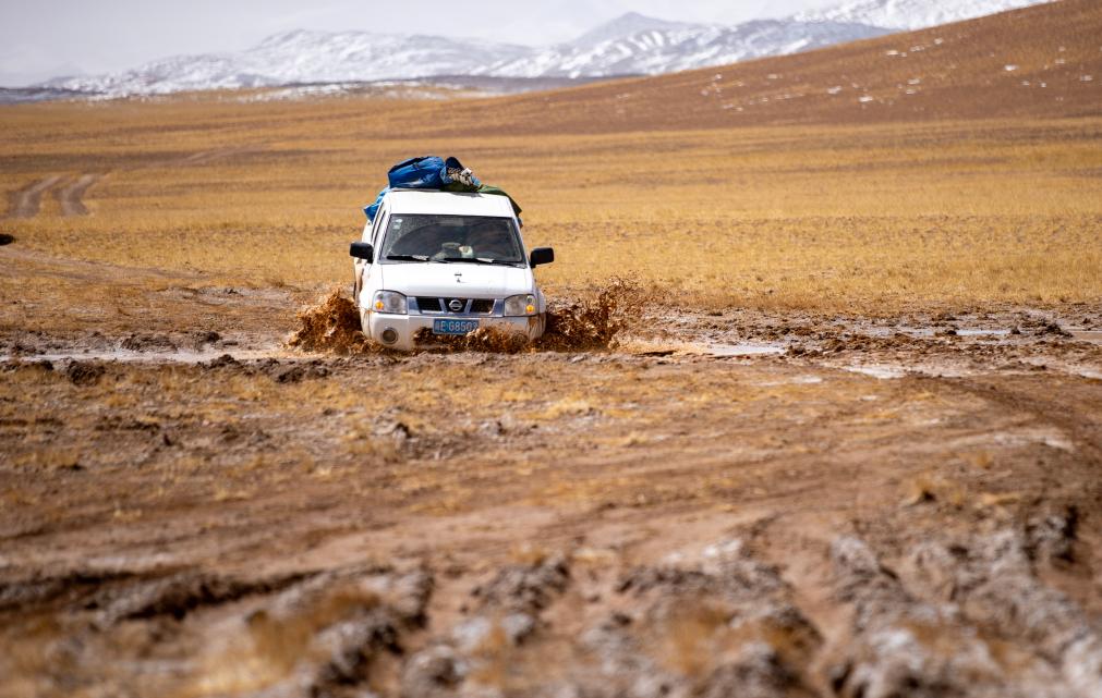 離開尼瑪縣城,巡山隊伍沿土路行進。很快,土路沒有了,車隊只能沿著之前巡山時留下的車轍走。找不到車轍的時候,山就是路標。