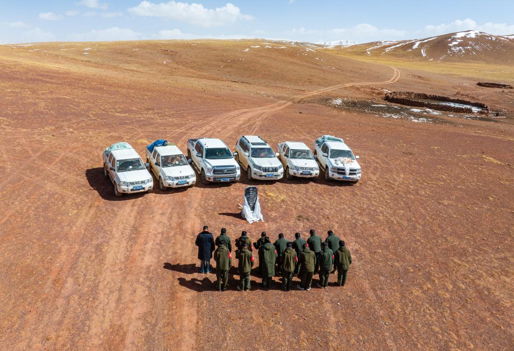 野生動物專業(yè)管護隊員在羅布玉杰烈士紀念碑前默哀致敬(無人機照片,5月10日攝)。新華社記者 姜帆 攝