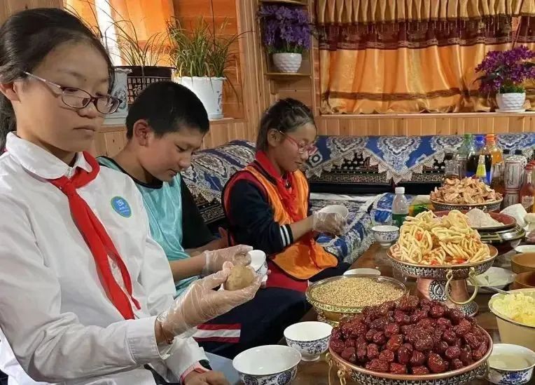 在“藏家”融情交流中,各地少先隊員在農(nóng)家一起學(xué)習(xí)制作西藏傳統(tǒng)美食糌粑、卡塞等,一個個極具創(chuàng)意造型的“小卡塞”,精致巧妙,隊員們共學(xué)、共樂、共享,體悟藏家民族風(fēng)俗,沉浸在歡樂的氛圍中。“參加此次主題隊會交流活動我非常開心,深度體驗了‘藏家’民俗,看到祖國邊疆鄉(xiāng)村的小康生活,豐富的活動讓我增強了對中華民族優(yōu)秀文化的認同感和自豪感,我要繼續(xù)爭做小石榴籽,切實鑄牢中華民族共同體意識”來自重慶市璧山區(qū)劍山實驗小學(xué)五(3)中隊隊員李思穎表示。