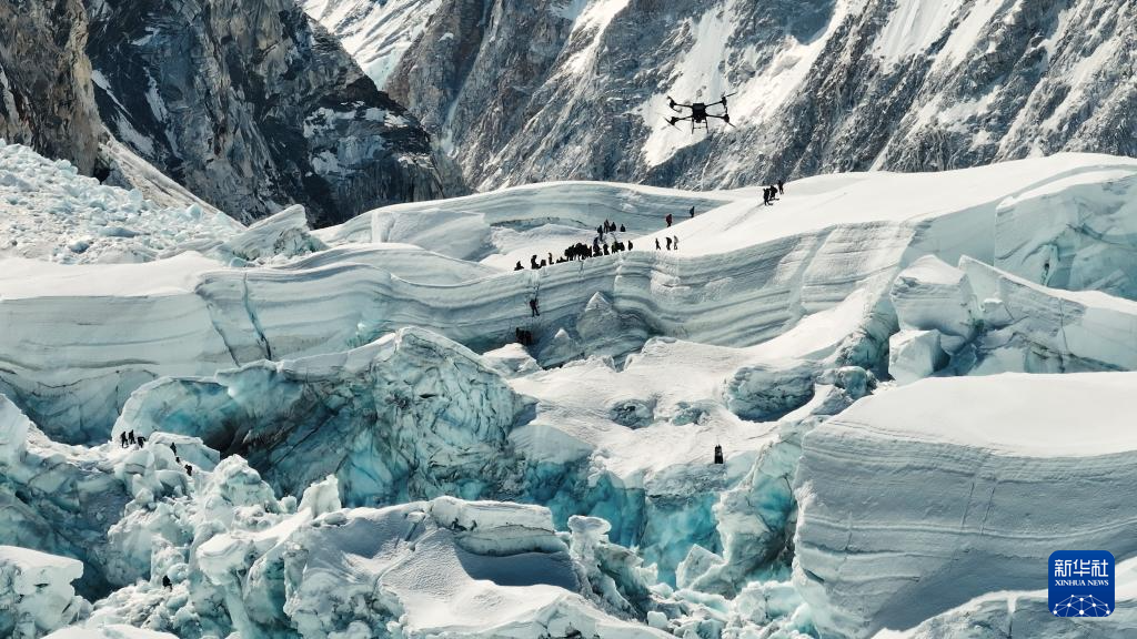 4月30日,大疆運載無人機在珠穆朗瑪峰南坡昆布冰川進行物資運輸測試(視頻截圖)。新華社發(fā)