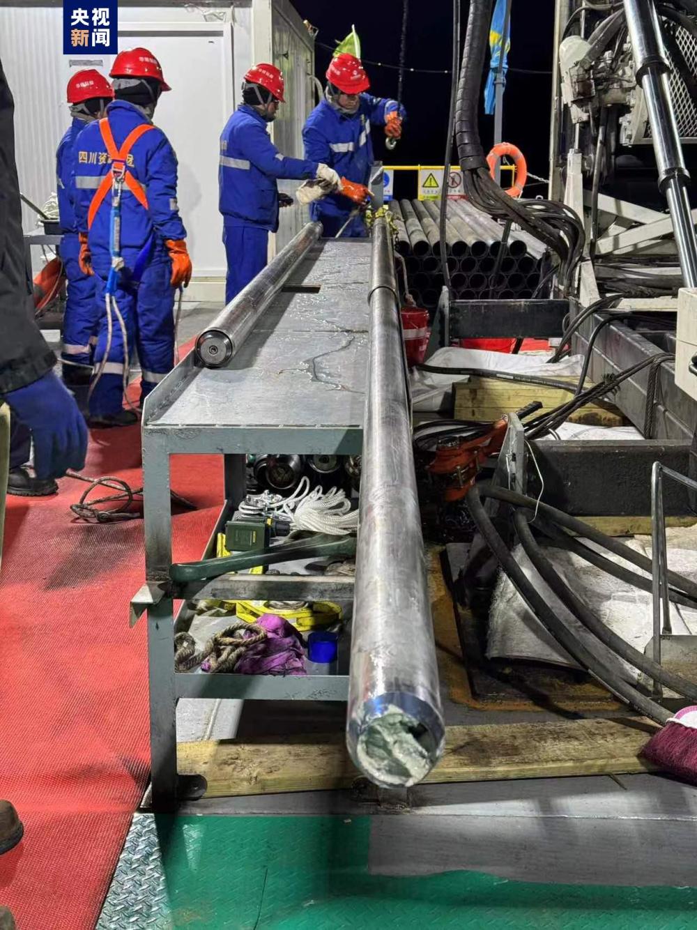6月6日作為鉆芯的第一天,經(jīng)過不斷地調(diào)整和試驗,當(dāng)晚23時20分,第一次正式鉆探開始,鉆頭深入到了水下95米左右的位置,在第一個點位開始鉆取湖泊巖芯。23時40分,科考團(tuán)隊獲得了第一批湖泊巖心樣本??蒲袌F(tuán)隊每次鉆取3米一段,通過24小時輪班不間斷作業(yè),截至7日早6時,已獲得9米長的巖芯。