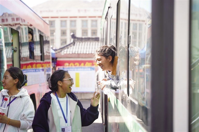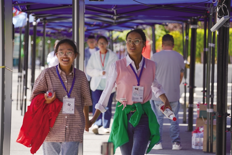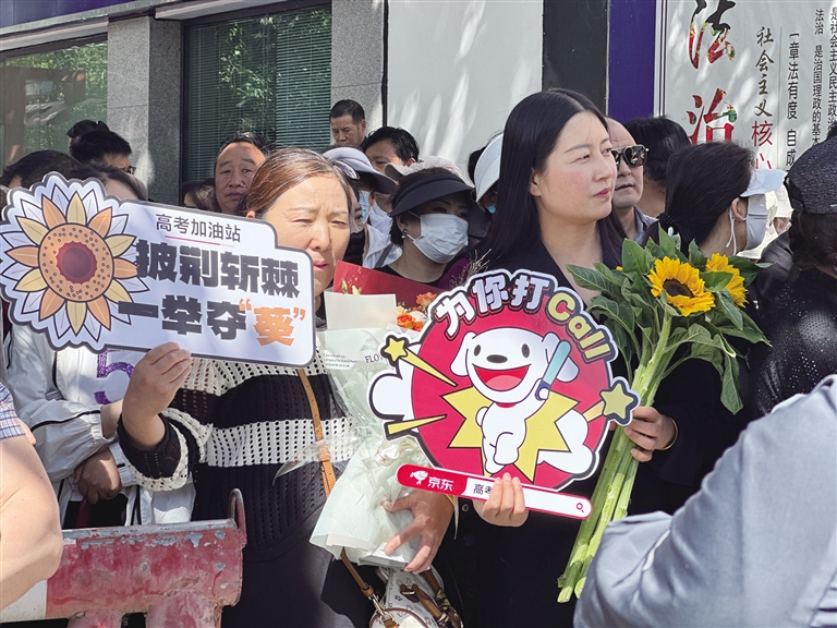 擊掌、擁抱……拉薩中學考點附近處處是為考生們加油的老師、家長。有些家長身著旗袍,有的老師手拿向日葵……給孩子加油打氣。