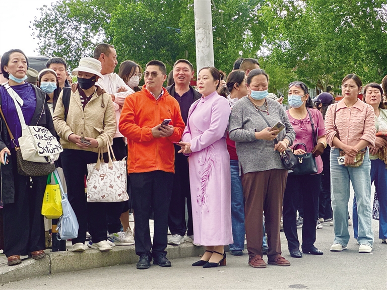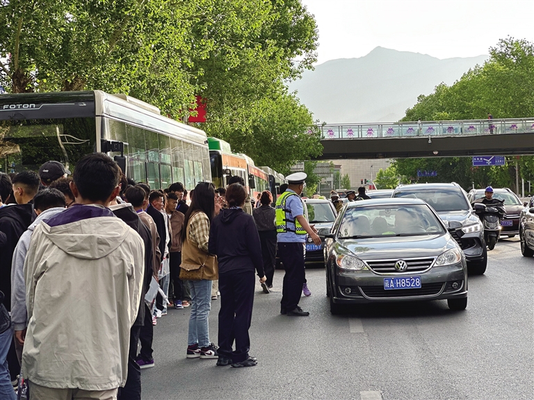 6月7日8點,太陽剛剛升起,拉薩中學考點附近人頭攢動。一輛輛愛心送考的公交車依次??吭隈R路邊,學生們排隊等候安檢進場,考點大門口的喇叭重復播放著考生進考場的溫馨提示。