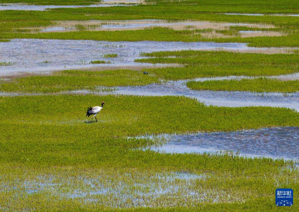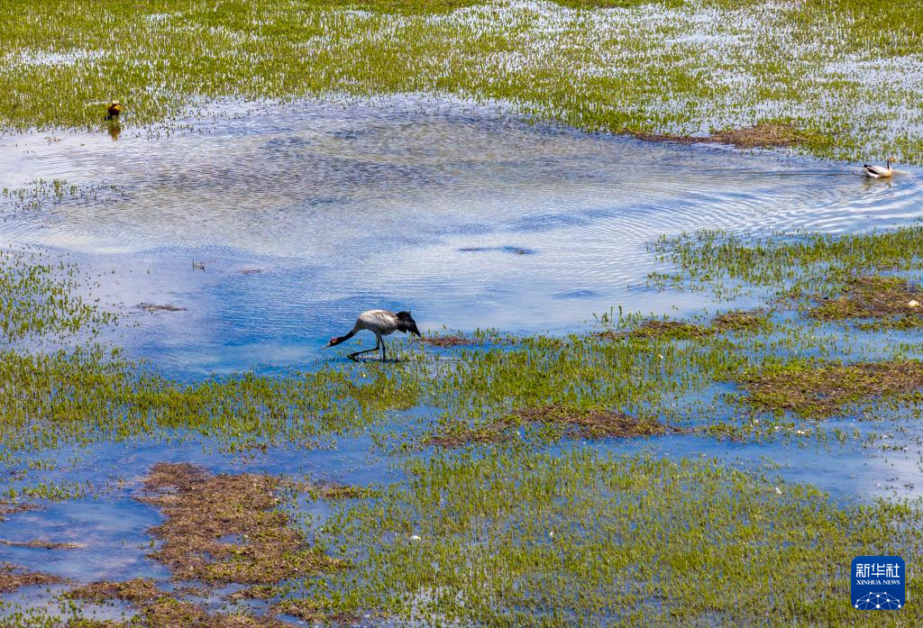 黑頸鶴在濕地覓食(6月8日攝,無人機照片)。新華社記者 姜帆 攝